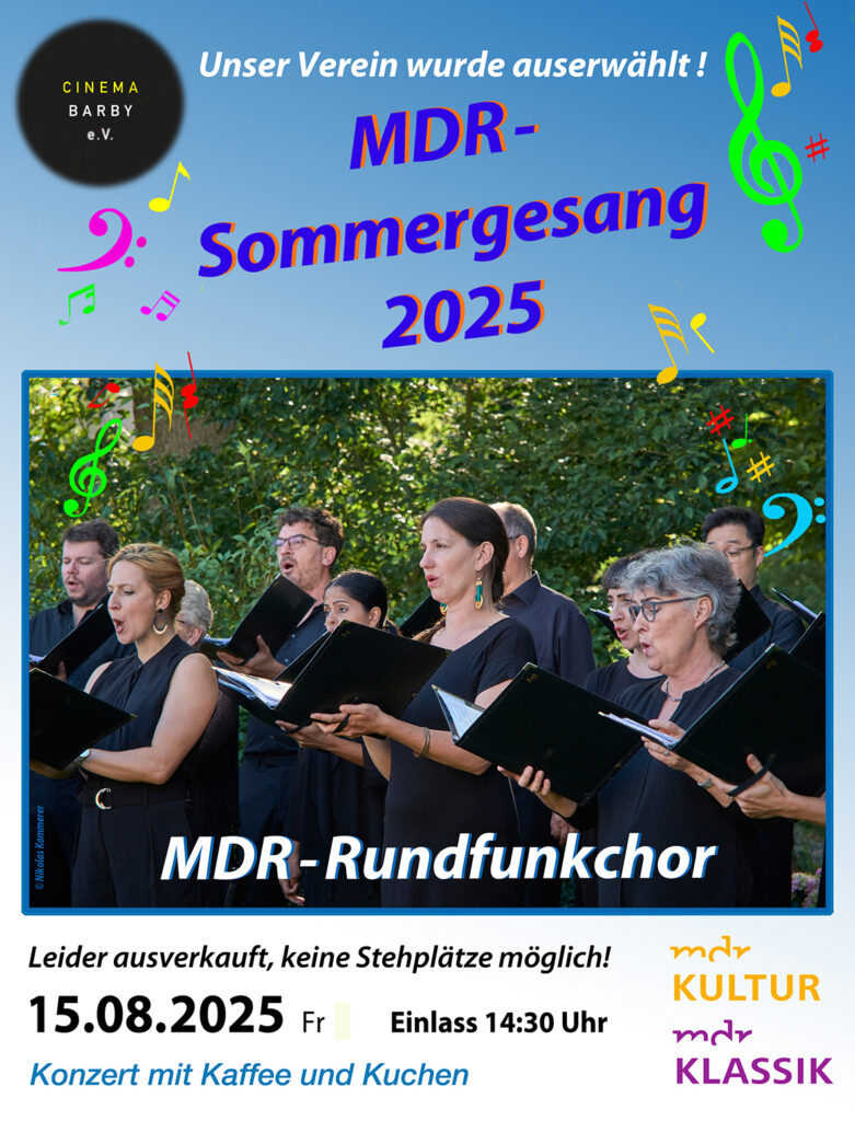 Als Danke für das gemeinnützige Engagement des Cinema Barby e.V. geben professionelle Sängerinnen und Sänger des MDR-Rundfunkchores bei ausgewählten Kulturinitiativen ein Sommerkonzert – auch im Cinema Barby als eine von 5 ausgewählten Spielstätten in Sachsen-Anhalt.