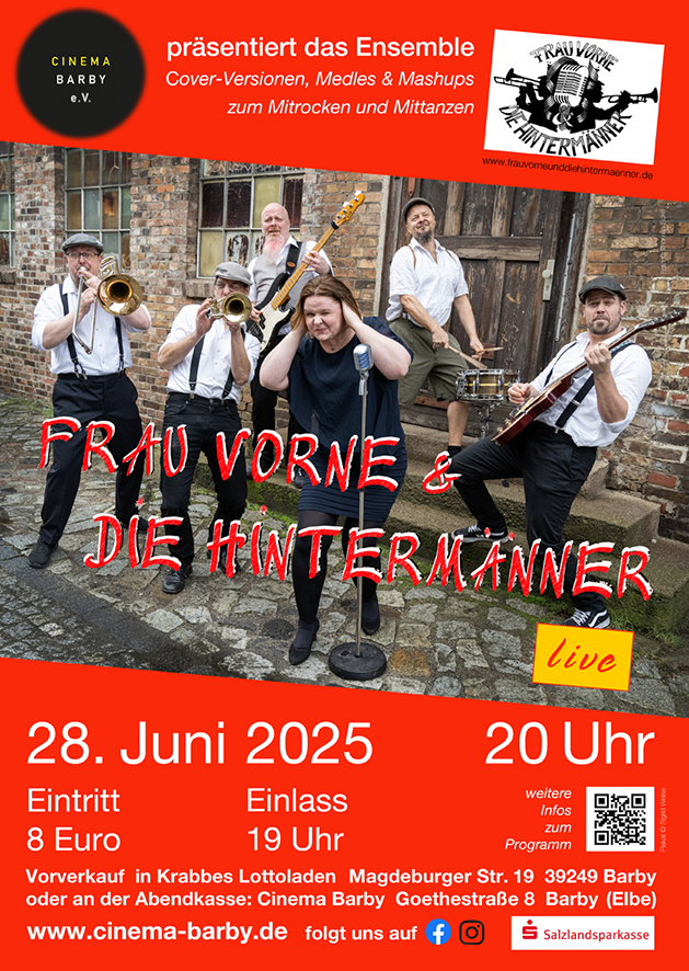Vor der Sommerpause lassen wir es nochmal krachen: Die 6-köpfige Berliner Band „Frau Vorne und die Hintermänner“ tritt im Kino auf. Ihre Musik, die in Richtung Ska und Rock geht, die aber auch Elemente aus Punk, Funk, Reggae und Pop enthalten, lässt Niemanden kalt, der sie hört. Mittanzen ist hier angesagt, weswegen auch die vorderen Sitzreihen im Kino ausgebaut werden und eine Tanzfläche geschaffen wird.